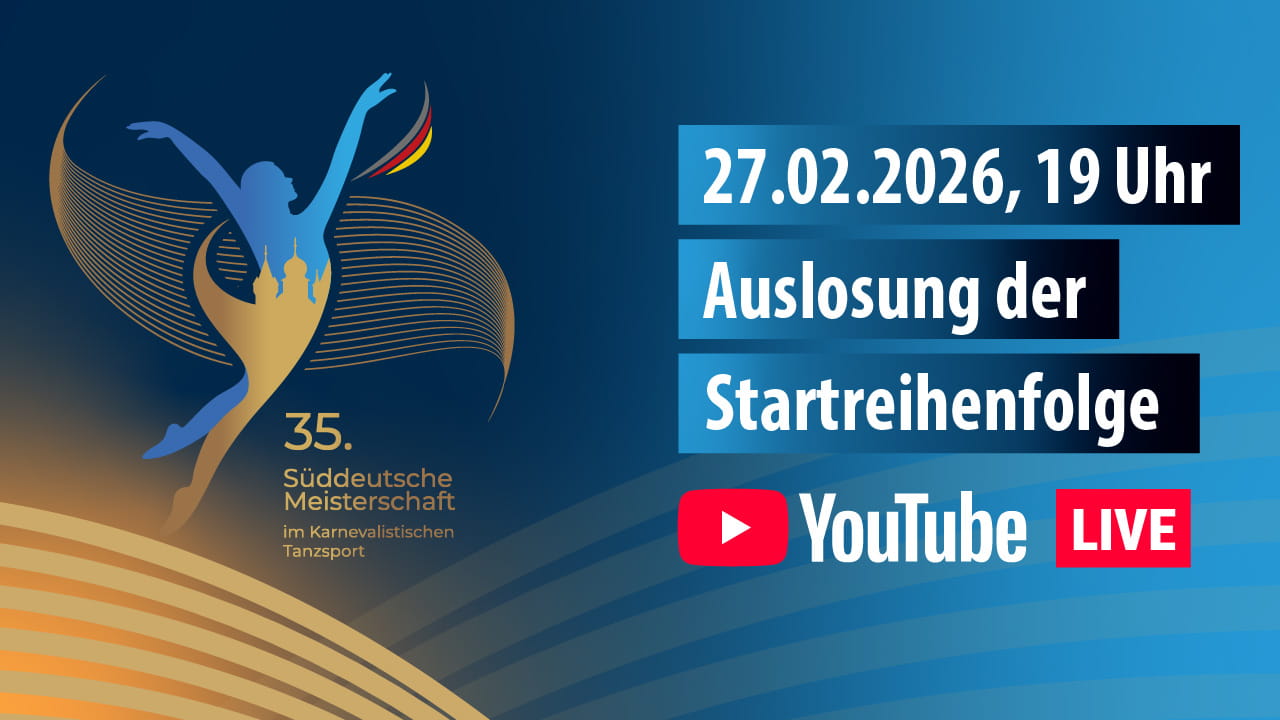 21. Februar 2026Am Freitag, den 27.02.2026 um 19:00 Uhr, findet die Auslosung der Startreihenfolge für die 35. Süddeutsche Meisterschaft im karnevalistischen Tanzsport statt.